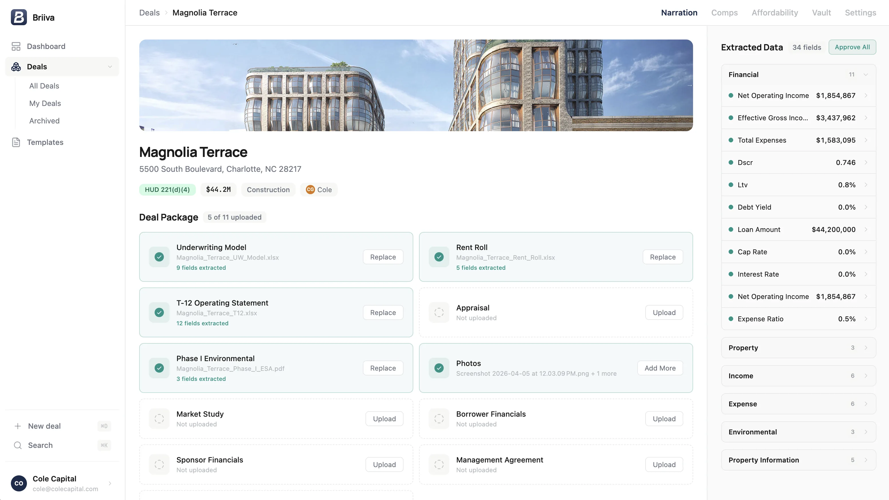 Drag in your underwriting model, rent roll, T-12, appraisal, and environmental reports. Briiva auto-classifies every file.